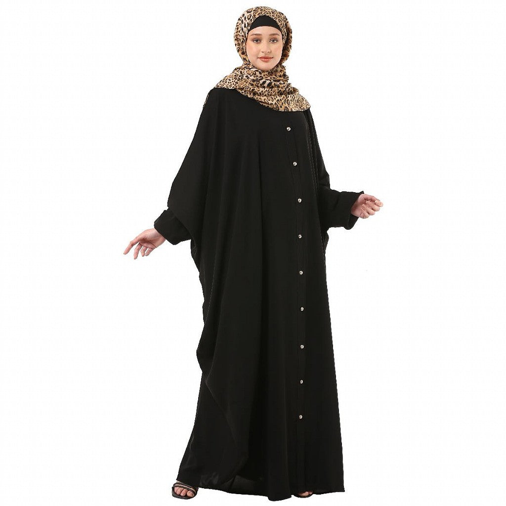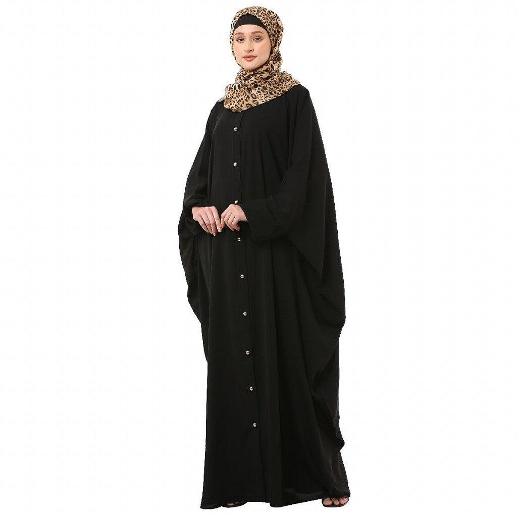 This is a designer free size front open black kaftan which has Fashionable buttons on the front and has elastic sleeves . The beautiful piece has been crafted from Nida matt fabric which is very, soft and breathable. One of the best abayas for any special occasion or for working ladies. It comes with a complementary Hijab that makes it more affordable.