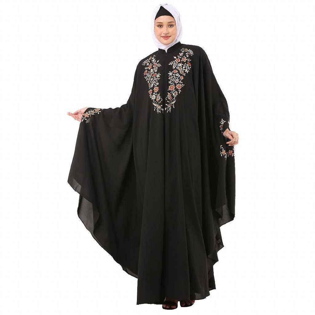 This is a highly recommended front open embroidery Kaftan Abaya. A stylist-designer burqa inspired by Irani kaftan style with a unique design that makes you feel traditional. . The most beauty of the dress belongs to the contrast threads embroidery at front and sleeves. This article is made of Nida (Matte Finish) fabric which is very Soft, Breathable, Light Weight and easy to maintain. It gives a good fall to the garment.