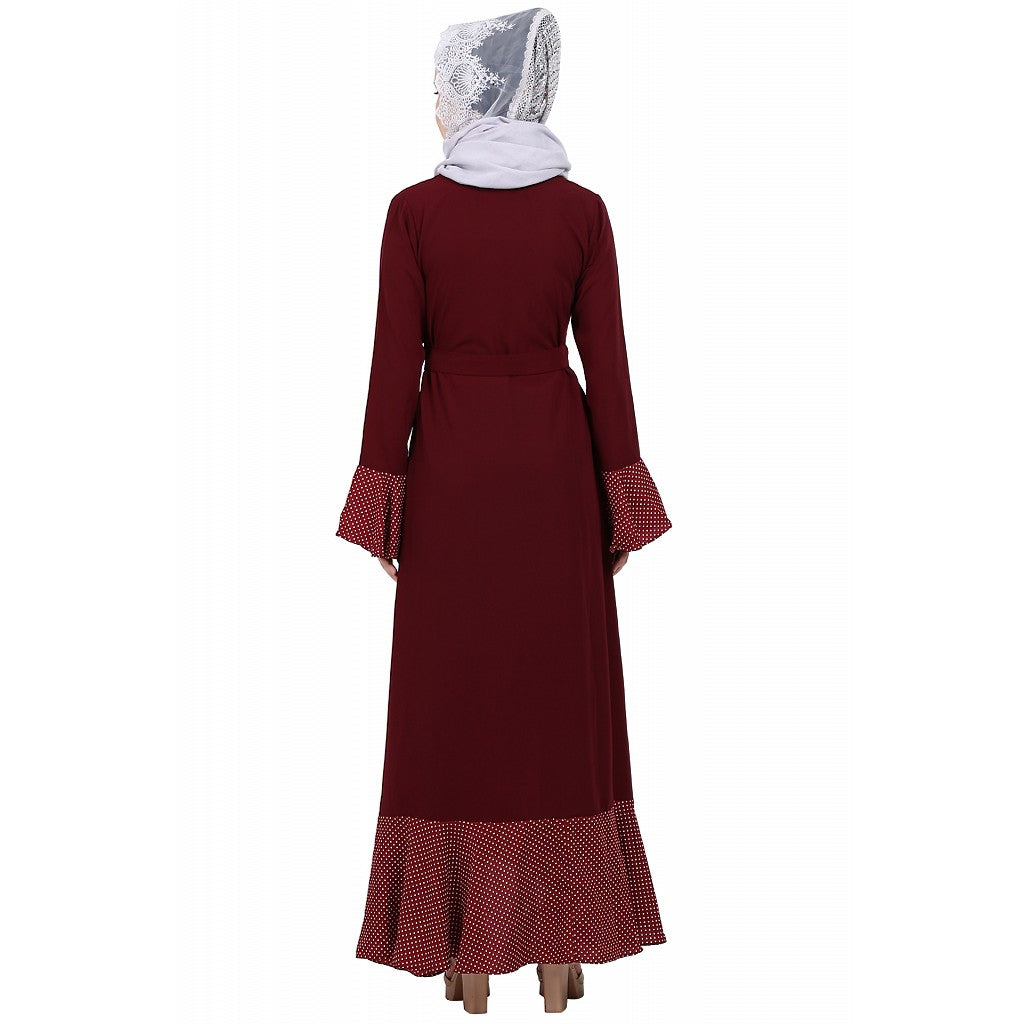 Designer abaya with Polka dotted frills- Maroon