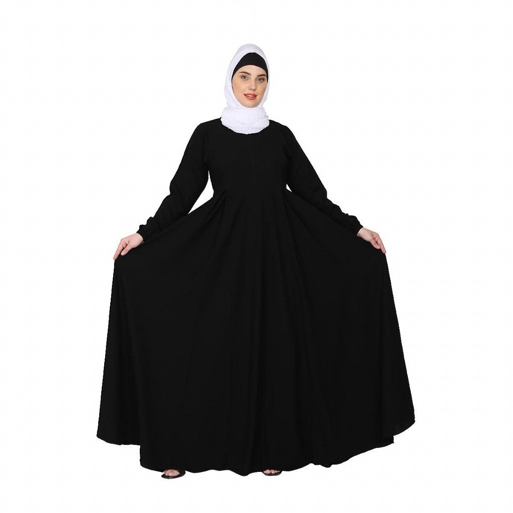 This full flared umbrella abaya dress in a Black color is a pure piece of sophistication with a upper front zipper and round neckline, frock-style appearance, and regular full sleeves. Crafted from comfortable Nida matt fabric, it is lightweight, soft and comfortable. This umbrella abaya is a must have for every sister as it can be worn irrespective of the occasion and season, that versatile a piece it is. The modest abaya looks beautiful with its flowy bottom for lovely movement and extra modesty.