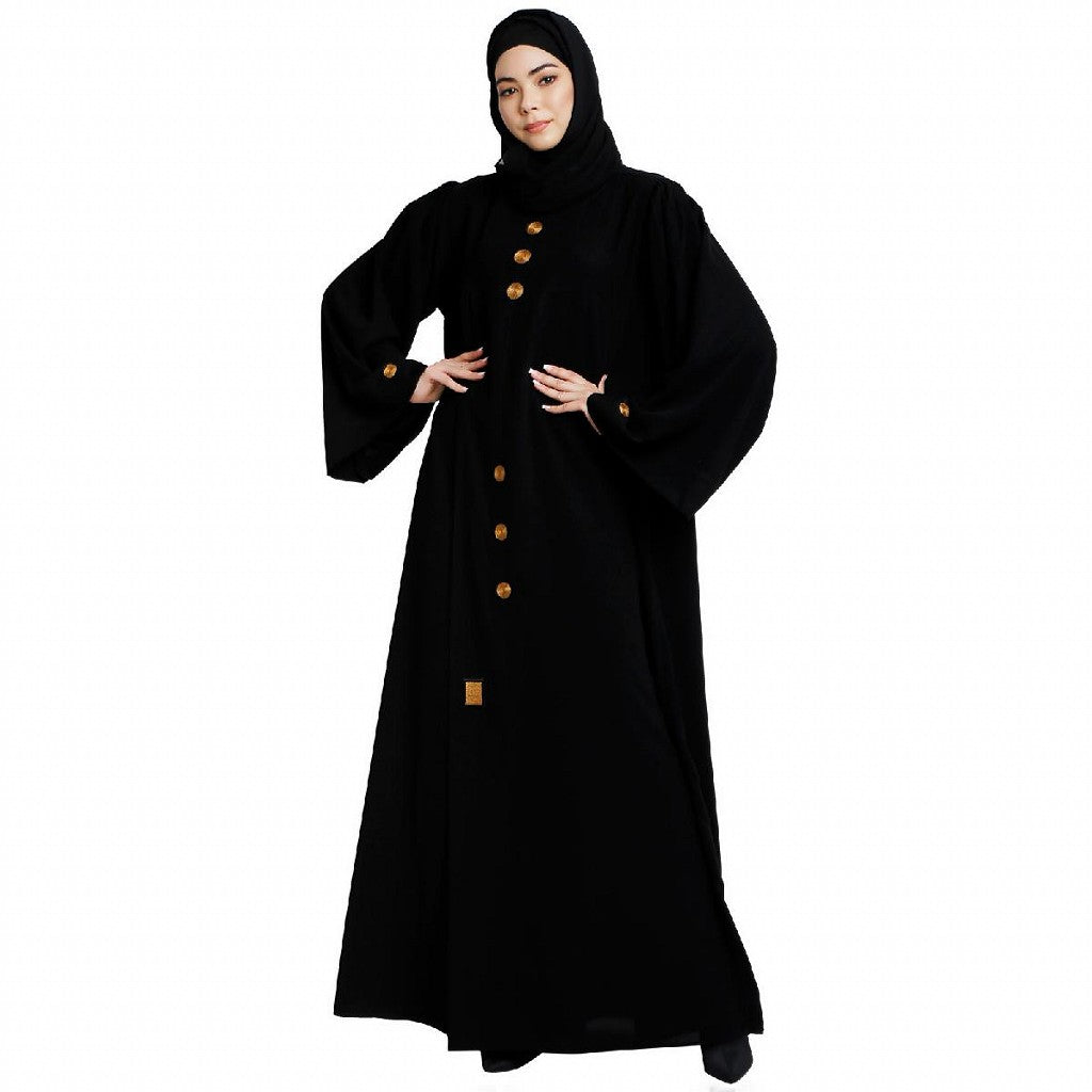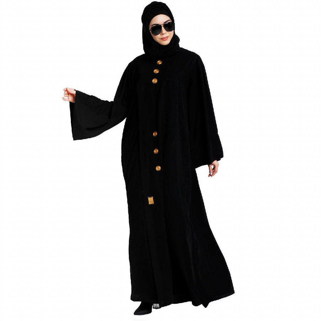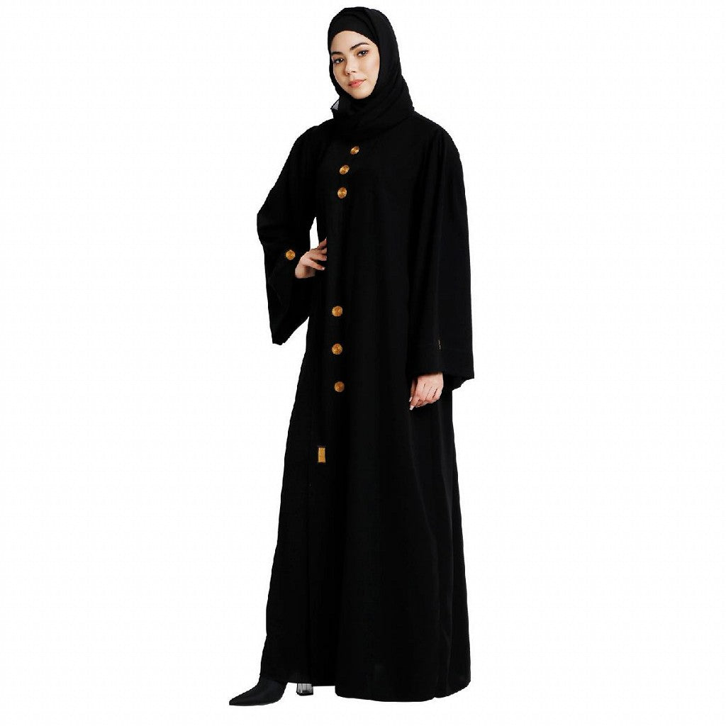 This article is a designer loose-fit abaya that is modest and stylish at the same time. This abaya has golden embroidery button work on the front and sleeves. This is a loose-fit Abaya that can be used as daily wear or for a special occasion. This article is made of Nida matte fabric which is very Soft, Breathable, Light Weight, and easy to maintain. It gives a good fall to the garment.