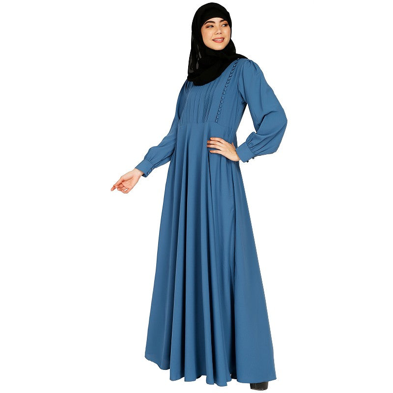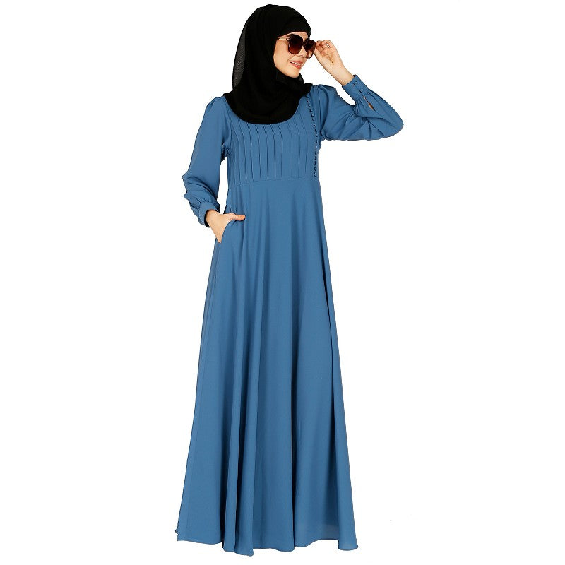 This article is a designer umbrella cut abaya with potli buttons neck design that is modest and stylish at the same time. This abaya has pleated design at the chest which gives a beautiful looks. This is a fit Abaya like Dress that can be used as daily wear or for a special occasion. This article is made of Nida matte fabric which is very Soft, Breathable, Light Weight, and easy to maintain. It gives a good fall to the garment.